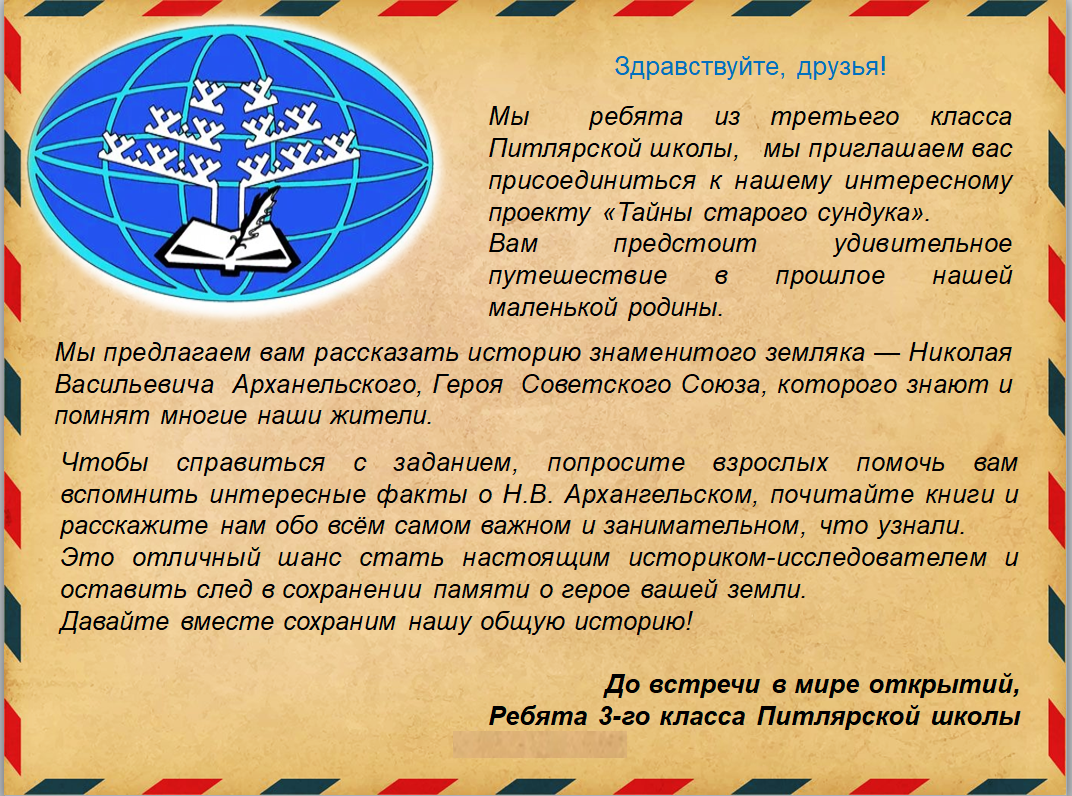 Продолжением первого этапа стала вторая тайна — исследовательская работа над проектом «Путь к подвигу». Ученики третьего класса отправились в путешествие по страницам истории родного края, написав письмо сверстникам из Мужевской школы. Вместе они приступят к созданию интерактивной карты «Путь к подвигу», раскрывающей жизнь и подвиги Героев Советского Союза, включая нашего славного земляка Н.В. Архангельского.